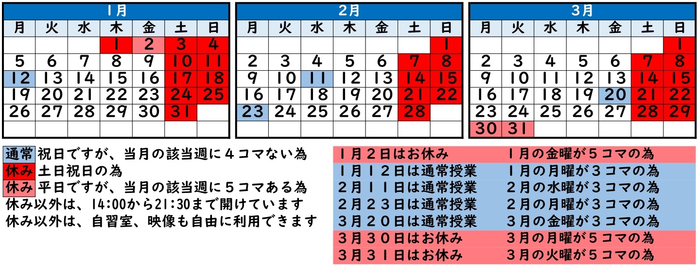 1月12日(月)は祝日ですが通常授業です。3月末まで祝日は全て通常授業です。
