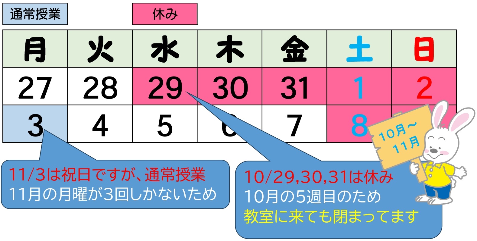 10/29~31休み 11/3通常授業 10/28火